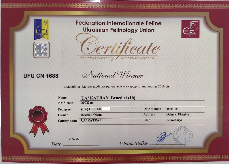 We, Elena and Pavel Bevziuk, are the owners of a small monobreed cattery KATRAN, which is located in the city of Odessa (Ukraine). The cattery was registered in the FIFe international felinological system in 2018 ("Lukomorye" club, Odessa).